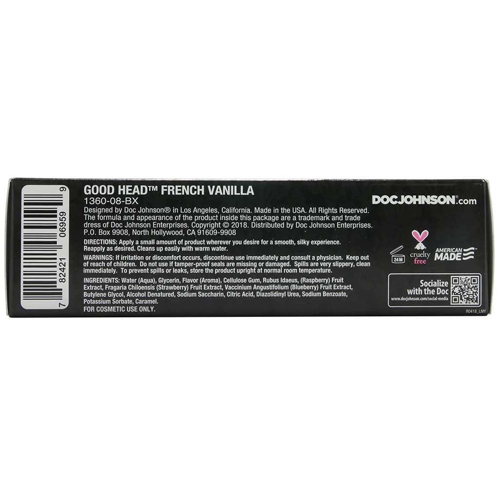 A silky smooth, devilishly delicious gel in warm French Vanilla, Doc's original GoodHead Oral Delight Gel makes licking, sucking, kissing and nibbling sexily super-slippery and mouth-wateringly tasty. To enhance oral sex for either (or both) of you, spread the sweetness with your hand and follow with your lips.