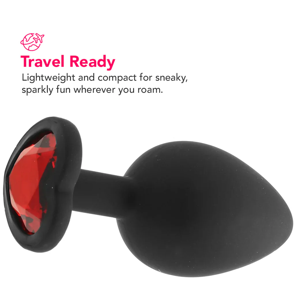 Inside, you'll find three classically tapered plugs in black silicone. They're each shaped for easy insertion, quick adjustments and removal, plus each features a sexy glittery heart at the base, but the similarities stop there. Size-wise, they're very different, all the better to help you a) work up to or b) dive right into butt play bliss.