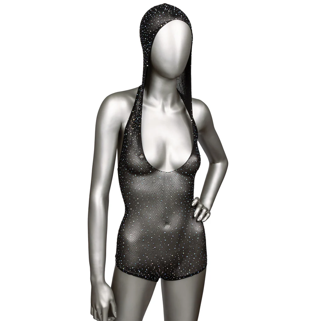 Rock some hooded drama as you show, share, and bring the love with Radiance's Hooded Deep V Bodysuit. This glittery, semi-sheer one-piece is guaranteed to highlight all your or their curves, front and back!