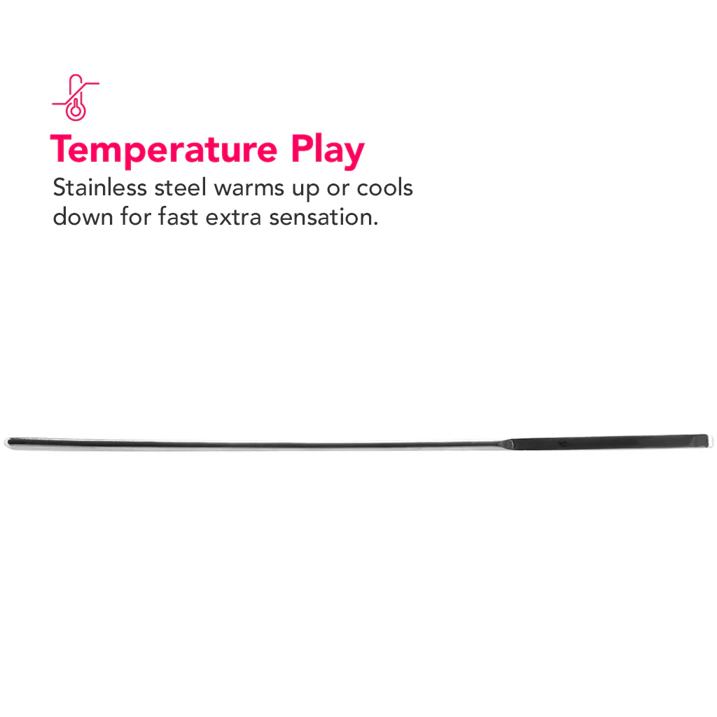 In solid, body safe stainless steel, the 4mm Urethral Dilator is naturally extremely firm and quite weighty. It's nice and long with a smooth rounded insertion point and easy to hold flattened handle. There's a very slight upward curve to the shape - this mimics the path of the urethra as it angles toward toward the prostate gland.