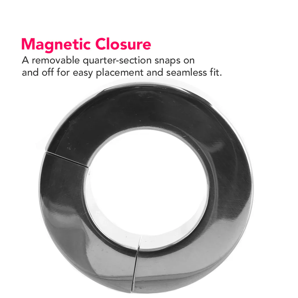 We'd like to state from the get-go that this is an advanced tool. It's heavy, at 8.9oz/253g, so if you're a ball stretching newcomer, this one's probably not for you. Here's how it works. The Stretcher will come to you in one piece, thanks to the power of magnetic energy. Approximately 1 quarter of the ring snaps off and on - you'll make use of this feature as you put on the Stretcher. Position the main portion over the base of your/their balls, and carefully replace the piece you've removed.